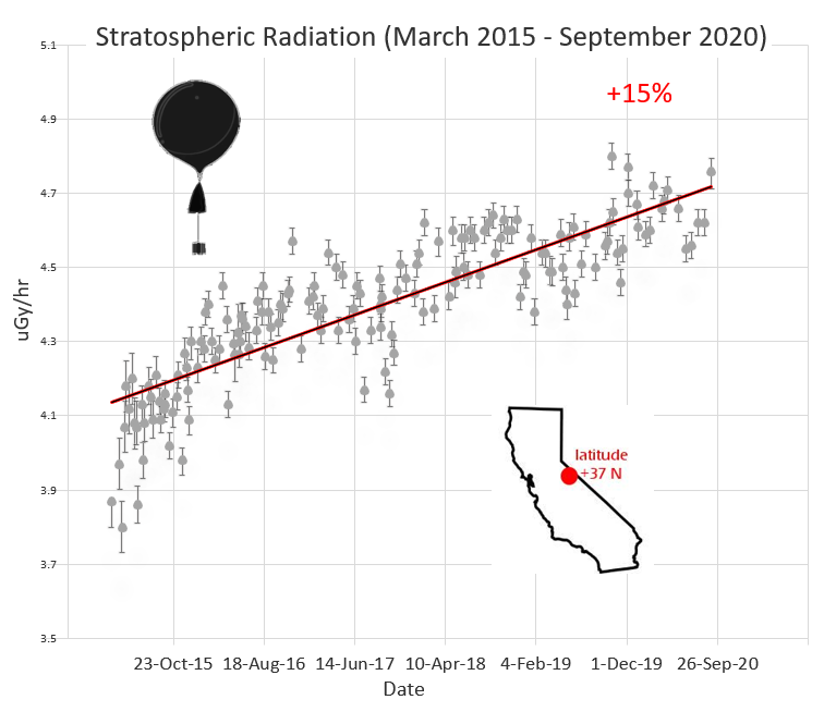 What's happening up there? The answer is "Solar Minimum." During the nadir of the 11-year solar cycle, the sun's magnetic field weakens, allowing extra cosmic rays from deep space to penetrate the solar system. These cosmic rays are hitting Earth's atmosphere, creating an intensifying spray of secondary cosmic rays that we detect with sensors onboard our balloons.